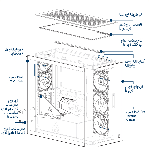 يدعم ما يصل إلى 3 مراوح مقاس 120 أو 140 ملم في الجزء العلوي وعلى اللوحة الجانبية.