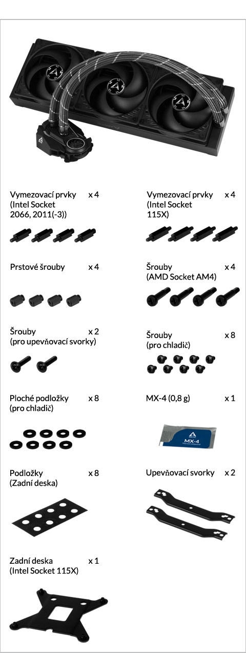 ** Pokud váš Liquid Freezer II není dodáván se sadou pro upgrade LGA1851/LGA1700, kontaktujte nás prosím prostřednictvím kontaktního formuláře nechte si zaslat sadu pro upgrade. Klepnutím přejděte k instalaci.