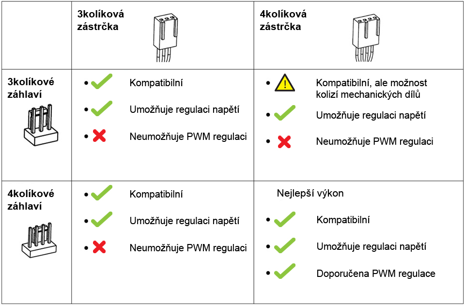 3-kolík a 4-pin jsou kompatibilní s křížem, ale s určitými omezeními, jak je znázorněno v tabulce níže.