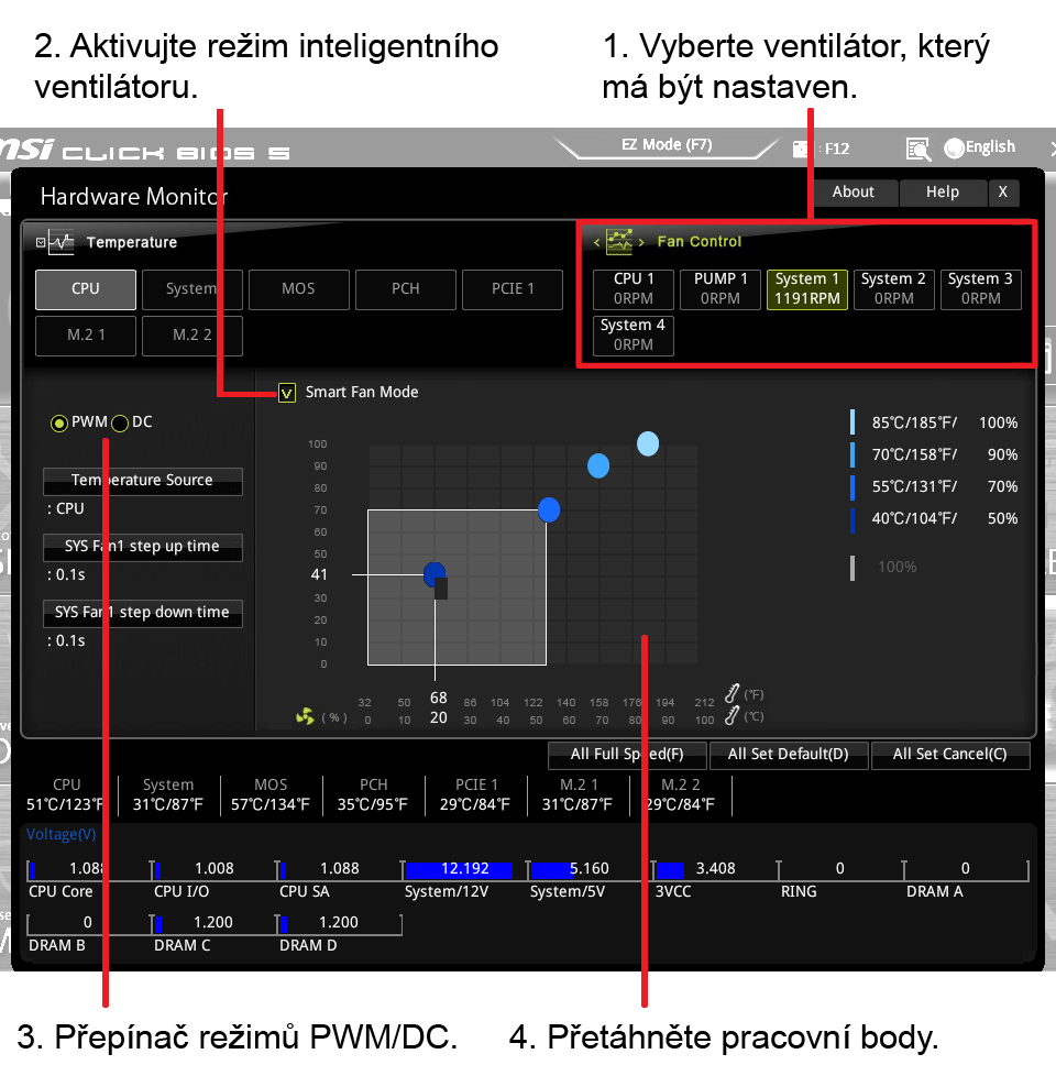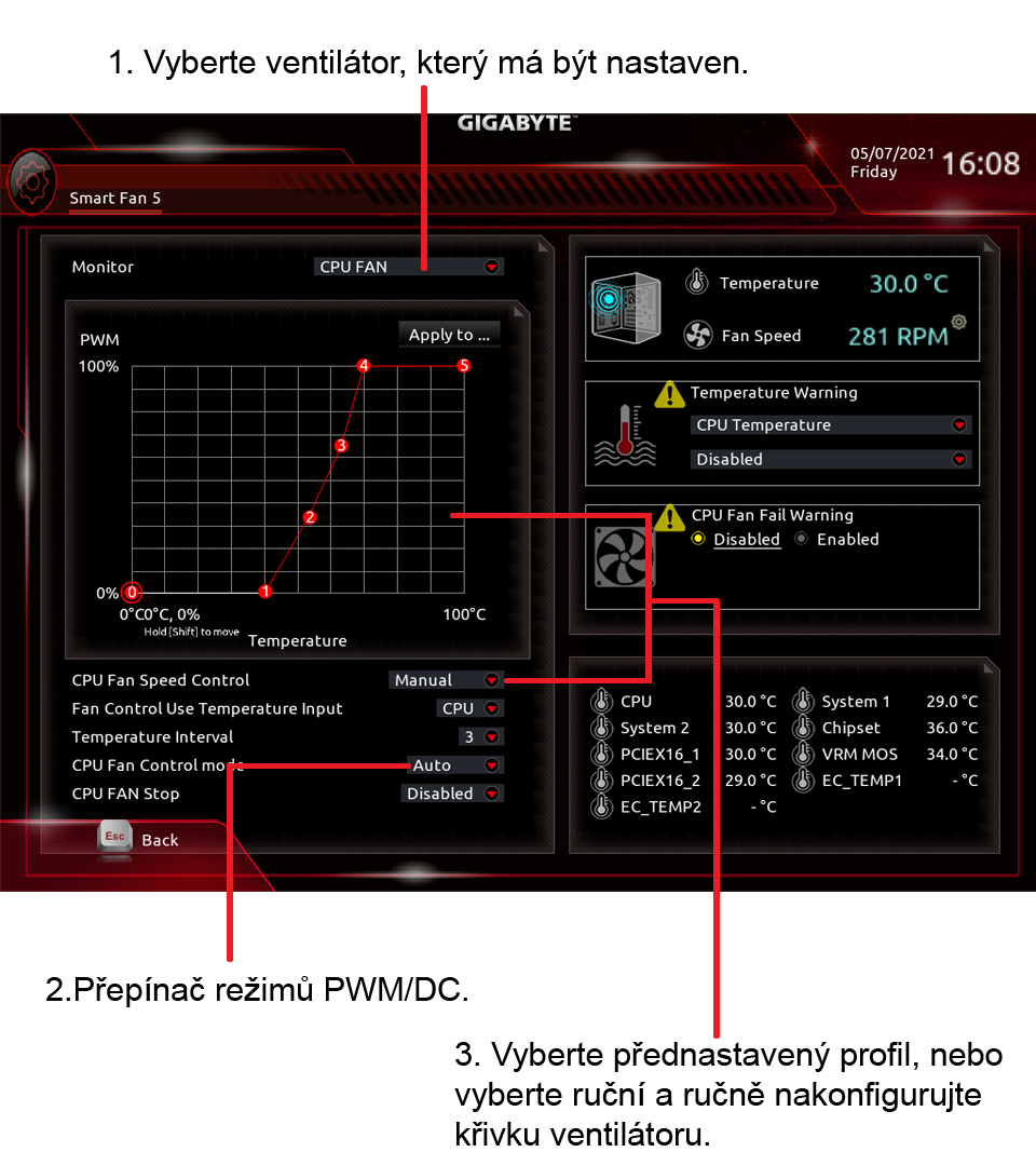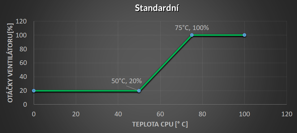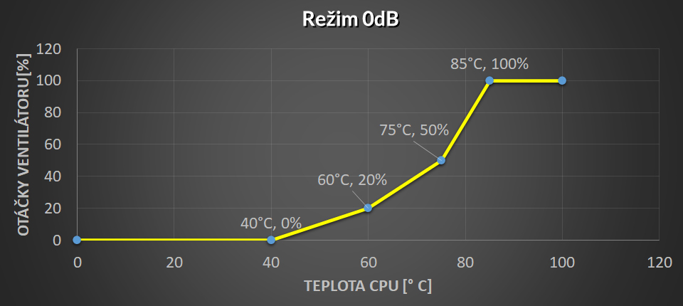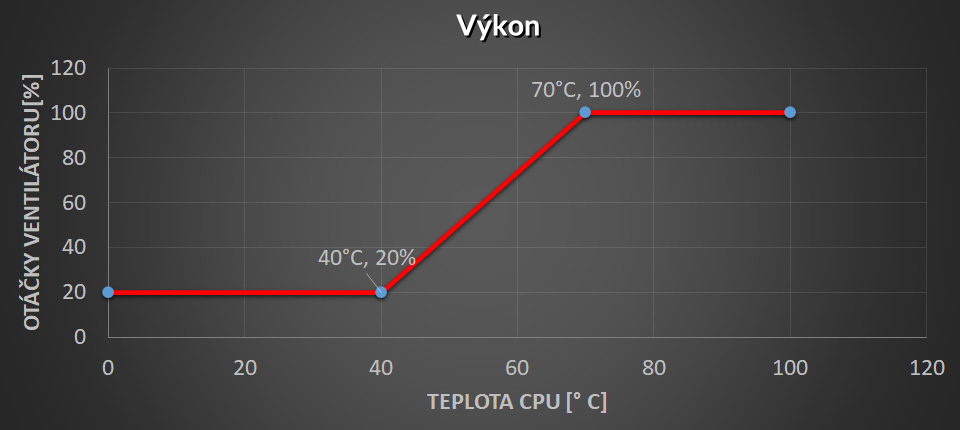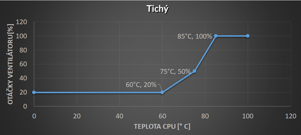 Minimální rychlost na 60 ° C, první sklon na 50% PWM 75 ° C, pak strmý sklon na 100% PWM @ 85 ° C