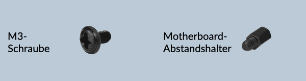 Bei mATX-Motherboards ist der zusätzliche Abstandshalter am Motherboard-Tray zu installieren. Das Motherboard wird dann mit M3-Schrauben befestigt.