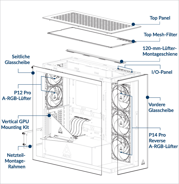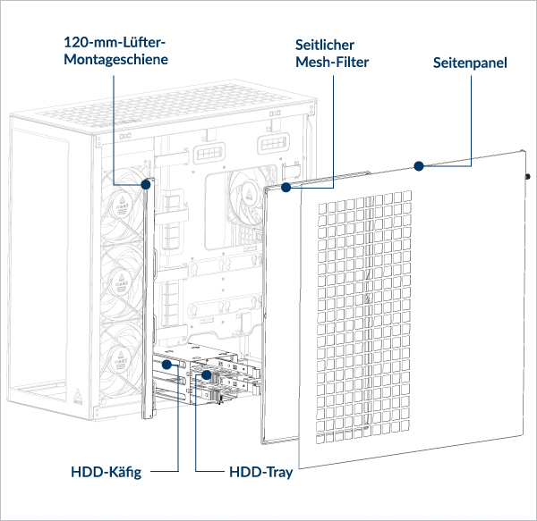 Unterstützt bis zu 3× 120- oder 140-mm-Lüfter an der Oberseite und am Seitenteil.