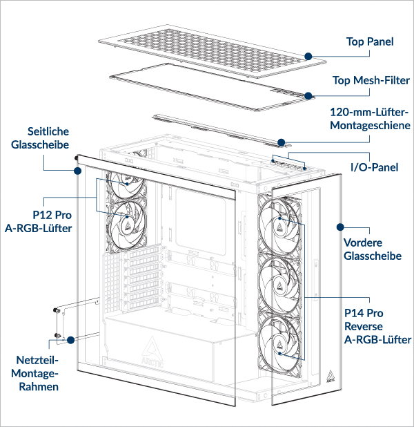 Unterstützt bis zu 3× 120- oder 140-mm-Lüfter an der Oberseite und am Seitenteil.