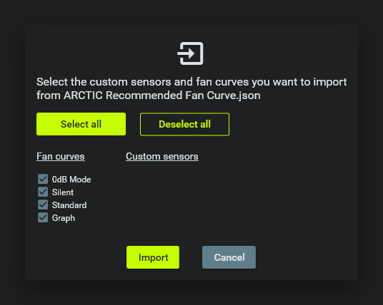 • Select “ARCTIC Recommended Fan Curve.json” and Import Fan Curves