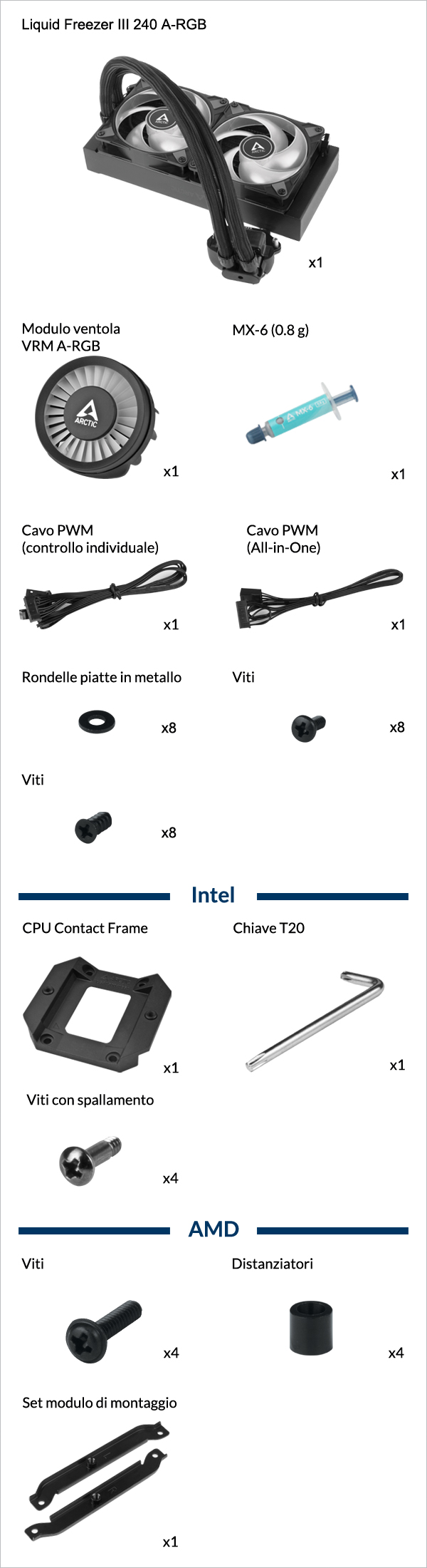Cavo PWM a connettore singolo per il controllo simultaneo della velocità della pompa, del VRM e della ventola del radiatore, nonché per il monitoraggio della velocità della pompa.