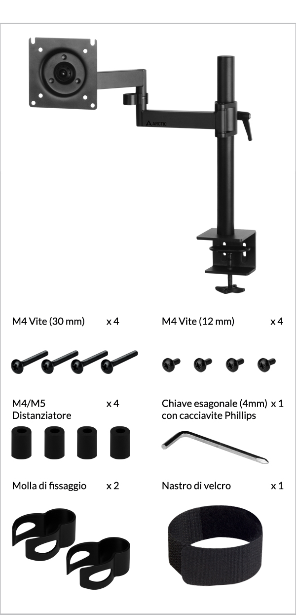 Fissare la posizione del braccio sull'asta stringendo la maniglia a vite fino a quando non è ben fissata.