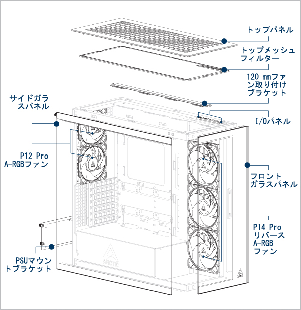 上部と側面パネルに最大 3 個の 120 または 140 mm ファンをサポートします。