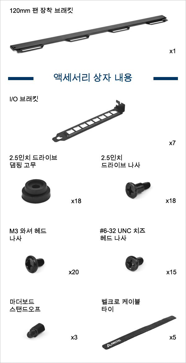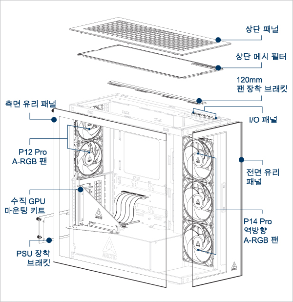 상단과 측면 패널에 최대 3개의 120mm 또는 140mm 팬을 지원합니다.