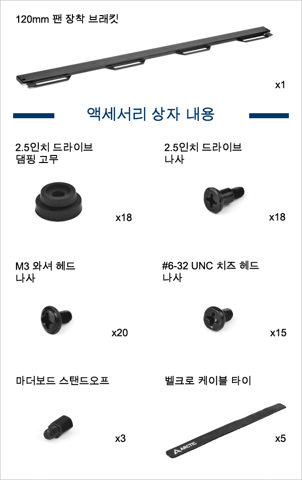 ATX 마더보드를 설치하려면 M3 와셔 헤드 나사를 사용하세요. 필요한 나사 개수는 마더보드 모델에 따라 다를 수 있습니다.