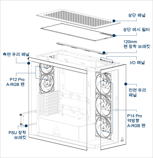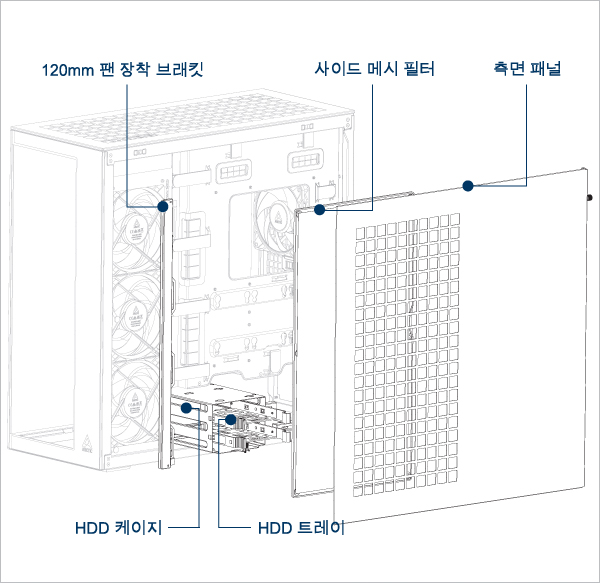 상단과 측면 패널에 최대 3개의 120mm 또는 140mm 팬을 지원합니다.