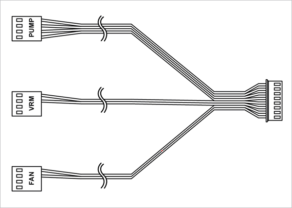Кабель ШИМ с одним разъемом для одновременного управления скоростью вращения насоса, модуля регулирования напряжения (VRM) и вентилятора радиатора, а также контроля скорости вращения насоса.
