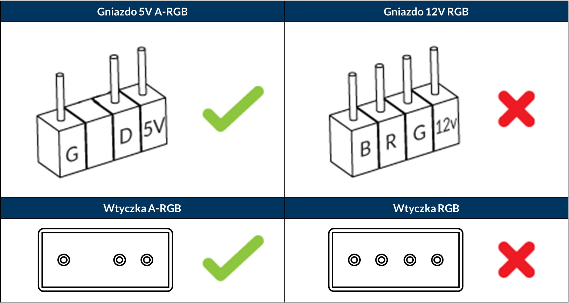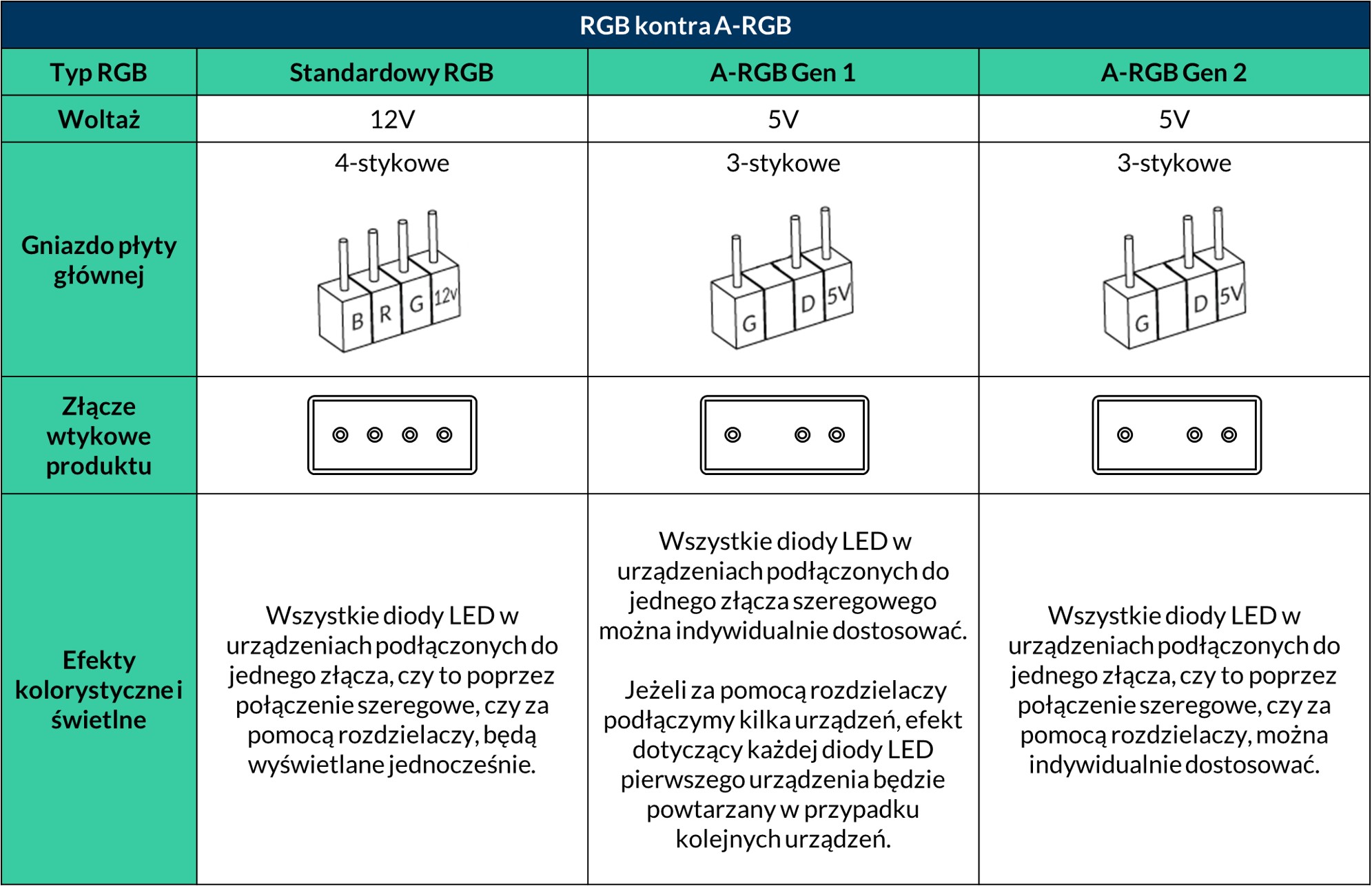 W zależności od marki i wersji najnowsze płyty główne zazwyczaj oferują dwa rodzaje wizualnie odróżnialnych nagłówków związanych z oświetleniem RGB: