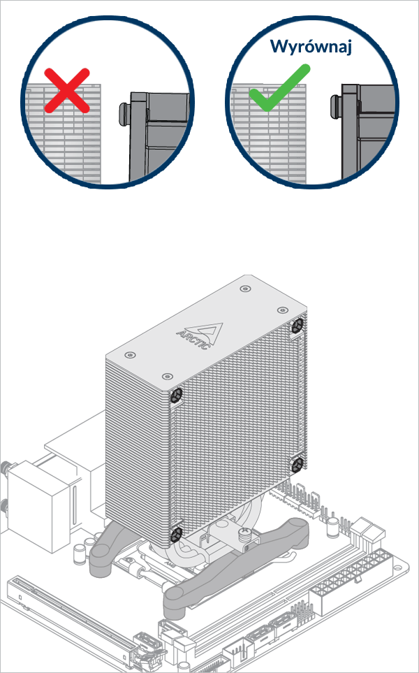 Luźno dokręć wszystkie 4 śruby o 2 obroty, a następnie dokręć je równomiernie na krzyż, aby uniknąć uszkodzenia procesora.