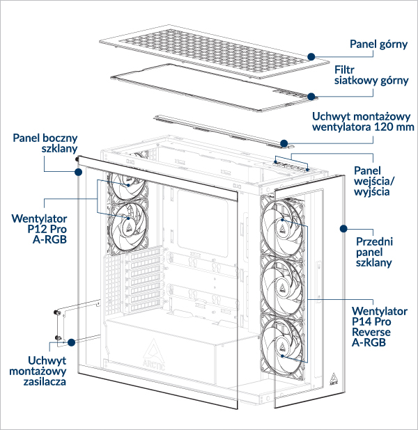 Możliwość montażu do 3 wentylatorów 120 lub 140 mm na górze i na panelu bocznym.