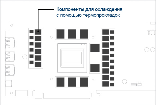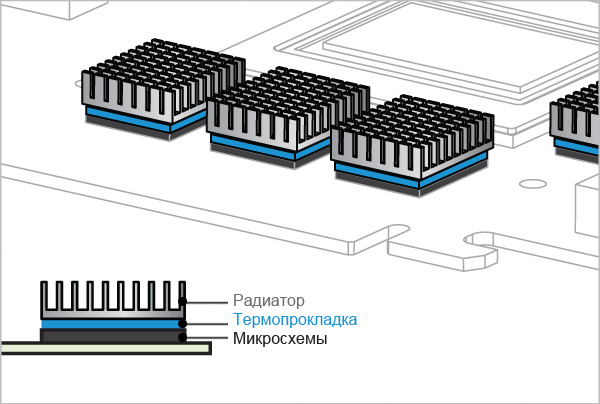 Целью применения термопрокладок является устранение зазора между источником тепла (например, GPU, оперативной памятью, микросхемами) и радиатором.