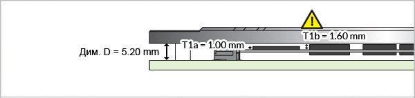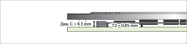 В то время как, Dim. A2 (верхний зазор для микросхем памяти) = Dim. D - Dim. B - 0,8 - T1b = 5,20 - 2,50 - 0,8 - 1,6 = 0,3 мм.