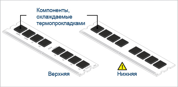 Если на нижней стороне планок оперативной памяти есть чипы, не забудьте наклеить термопрокладку и на эту сторону. Если нет, все равно рекомендуется применить термопрокладку на печатной плате, так как она поможет отвести тепло от чипов памяти.