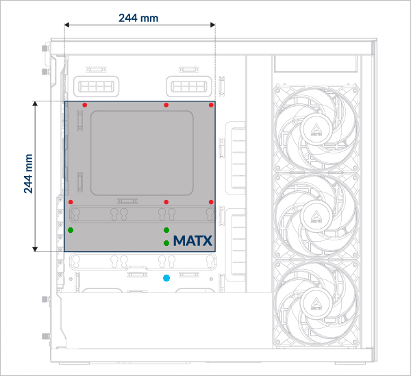 Lämna skruvhålet markerat med en blå prick tomt – det är reserverat för installation av det vertikala GPU-monteringssatsen.
