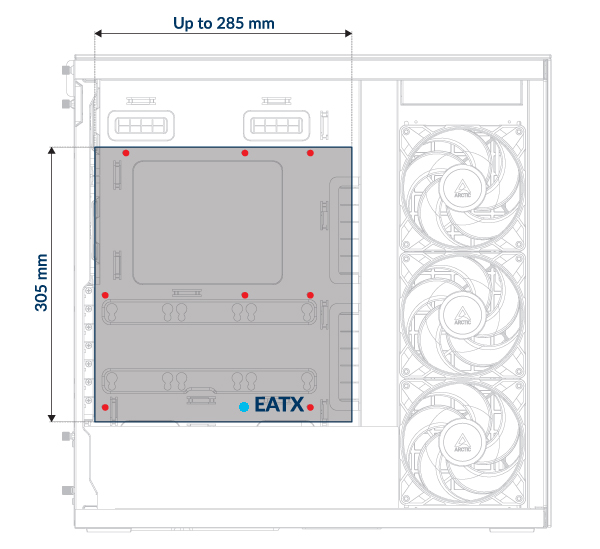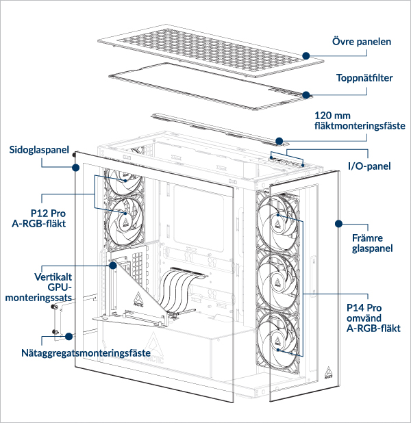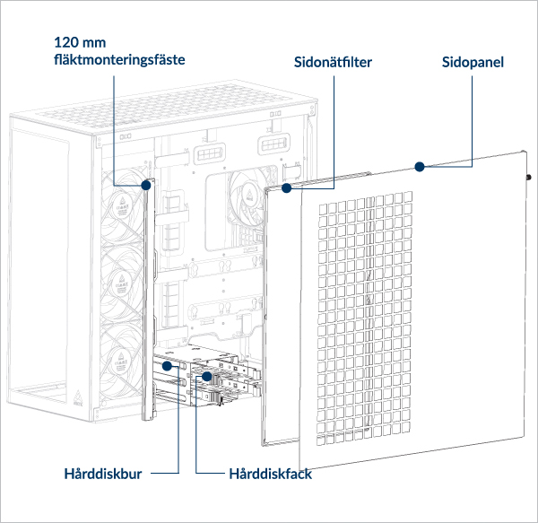 Stöder upp till 3× 120 eller 140 mm fläktar på toppen och sidopanelen.