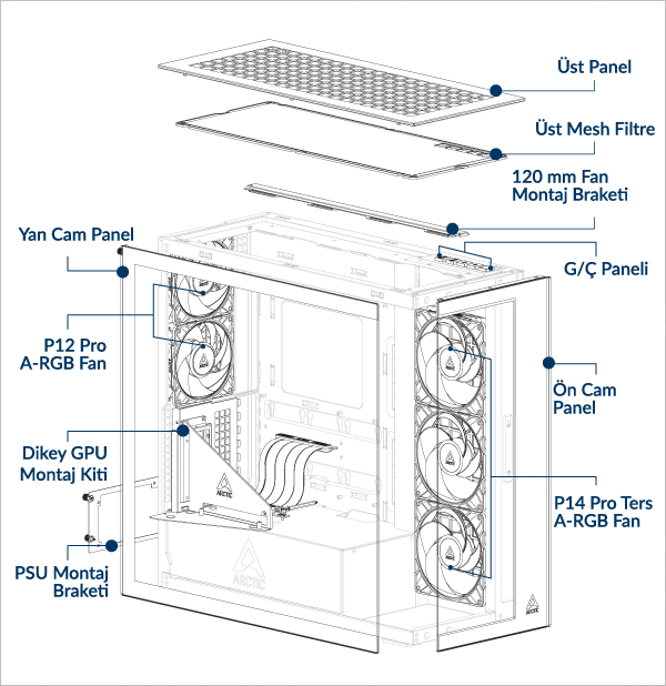 Üst ve yan panelde 3×120 veya 140 mm'ye kadar fan desteği.