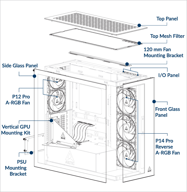 Supports up to 3× 120 or 140 mm fans on the top and on the side panel.