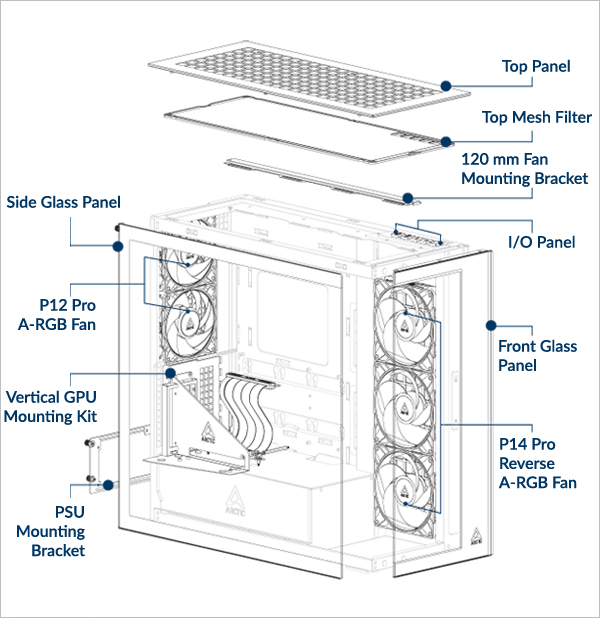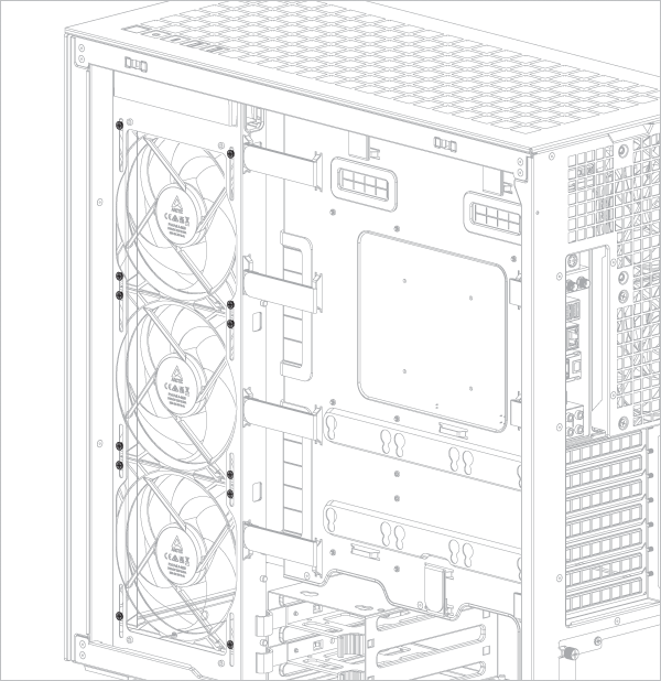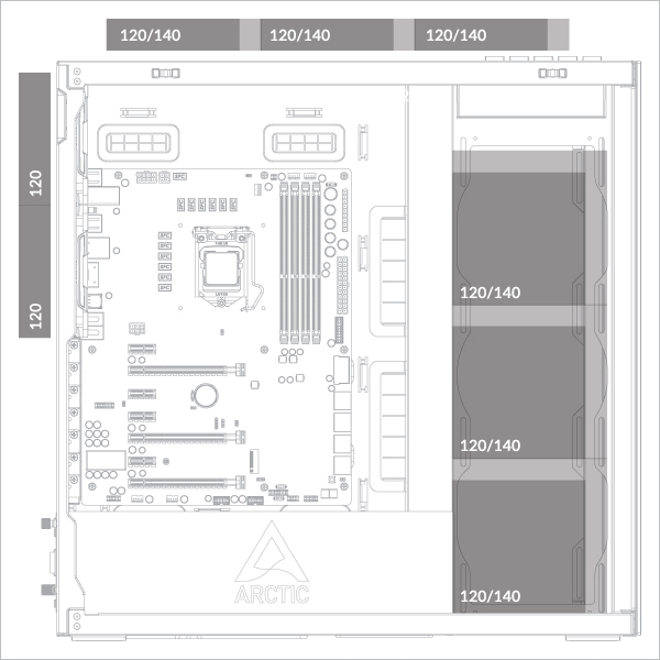 Supports up to 3× 120 or 140 mm fans on the top and on the side panel.