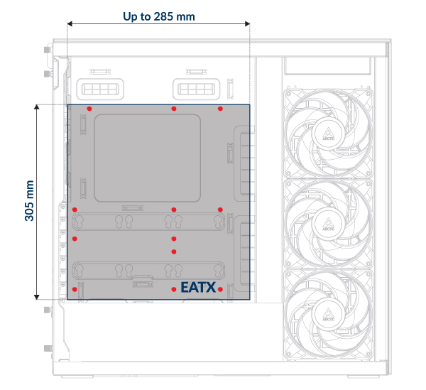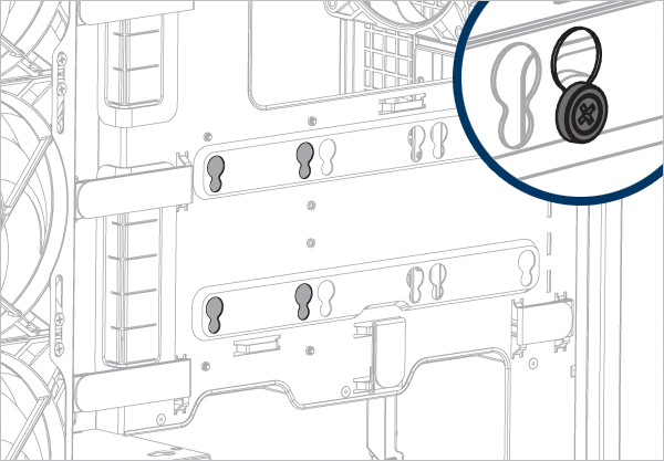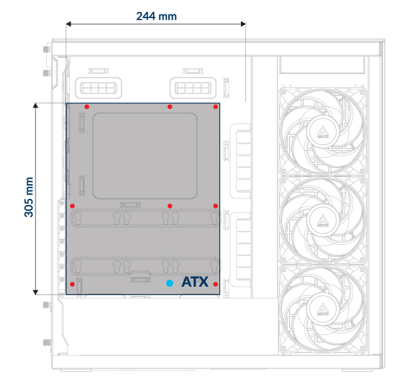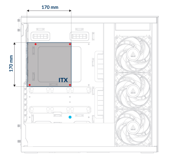 Leave the screw hole marked with a blue dot empty - it's reserved for installing the Vertical GPU Mounting kit.
