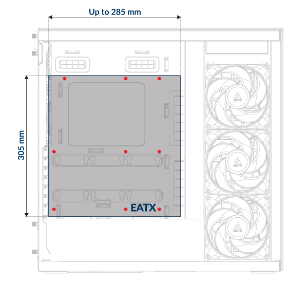 Mini-ITX, mATX, ATX, E-ATX (šířka až 285 mm)