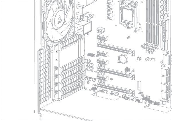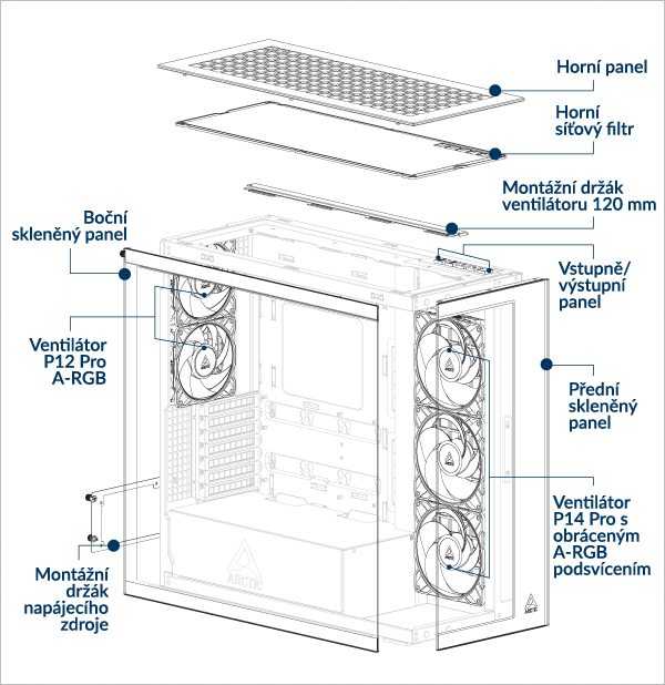Podporuje až 3× 120 nebo 140 mm ventilátory na horním a bočním panelu.