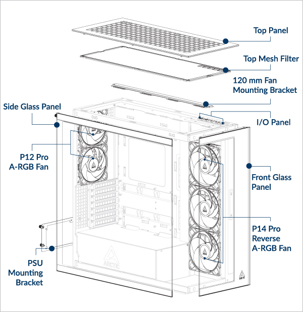 Supports up to 3× 120 or 140 mm fans on the top and on the side panel.