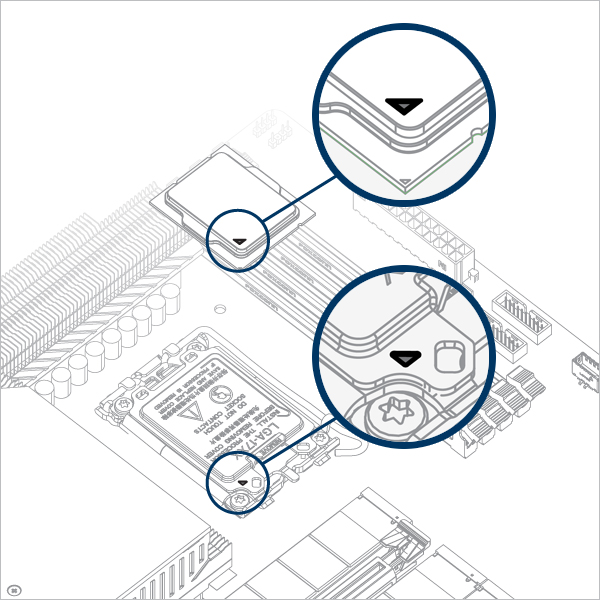 Loosely engage all 4 screws by 2 turns before tightening them in a cross pattern evenly to avoid damaging the CPU.